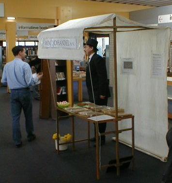 The first one was called "Win(z)dhandel". The title is a mix between the Dutch words Windhandel (Wind trade - a very speculative trade) and Winst (Profit), using a Z instead of an S because this type of misspelling was and is common on the Internet (e.g. sweetz instead of sweets). It was a comment on the way people were made to believe they could become very rich in a short period of time, e.g. by borrowing money to buy risky shares. This was long before the Subprime mortgage crisis and the fall of Lehman Brothers, as it was planned and prepared during 2004 and 2005 and performed in 2006. At the start of my exhibition in our local library, I set up small stand. What I sold were gold painted (high quality) books, with all pages glued together (except for one spot - where the pages were painted in gold). The buyer received it sealed with a signed certificate of origin. A huge graph hanging at the back of the stand suggested that the value of the objects might explode during the years after. (Might - nothing was guaranteed). A statement said that the products "were seen by accountants". Firstly in the Netherlands the title accountant without any additions (like R.A.) is not protected, so all people with some knowledge of book keeping - including myself - could call themselves "accountant". Secondly the word "seen by" suggests some verification, but actually it can also mean that somebody glanced at the books. Not many people decided to invest and the ones who did knew it was just a performance.